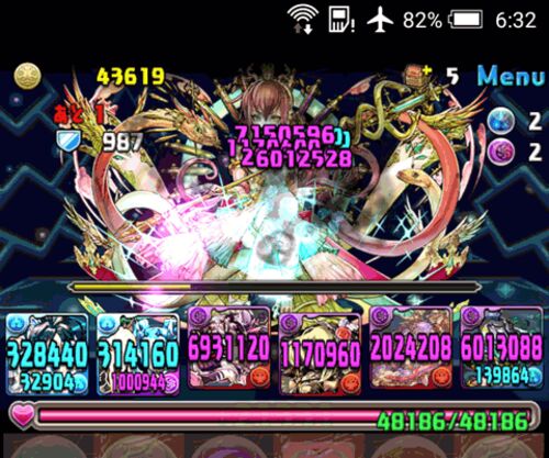 スタート時は転生ハク+闇アテナだったのだが、ボスのリーダーチェンジがとにかく多いのでカリンになった時点で水闇大量消しで大ダメージ。もちろんパンドラちゃんで闇大量消しでもいいだろうし、色んなリーダースキルを想定しておくと便利。ダメージはあま…
