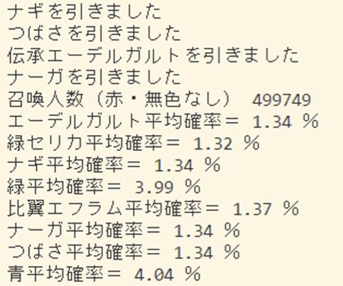 本当は、緑だけ引いた場合と緑・青を引いた場合の使用オーブの差を検証したかったのだがかなりコードが煩雑になるのでとりあえずベースの8%固定のガチャを回しまくった。 当たり前であるが、闇雲に引くとエーデルガルトの出現率は0.666%になるところ緑青に絞…