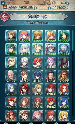 貼る画像がない時は英雄値一覧に限る、かどうかはわからないが現況である。つおいキャラというより、「連戦ボーナスになるかどうか」が肝心な様相である。なお糸目僧侶は未だに英雄値ゼロ。どんだけ嫌いなんだってハナシだ。あと未だに深刻な赤魔不足は続い…